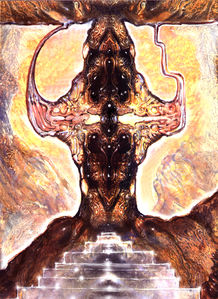 The exquisite landscapes and character design executed by Venosa for Dune are incomparable visions of the fantastic. Frank Herbert's masterpiece, as interpreted through the dreamlike art of Venosa, promised an inspired collaboration that would have translated magically onto the screen. However, as often happens in Hollywood, the production staff changed hands in mid-stream and Venosa's work was sacrificed to the gods of banality. H.R. Giger was another whose designs on the project were also scrapped. One can only imagine what might have been.